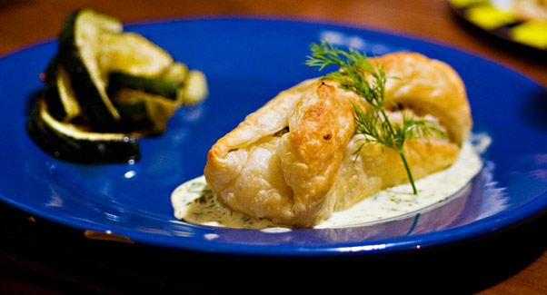 - Preheat oven to 350F - Heat oil on medium heat in a large saute pan. - Add mushrooms, garlic and artichoke. Saute until mushroom is soft and nearly all the liquid disappears (about five minutes). - Remove from heat and add cream cheese and mix until all ingredients are combined thoroughly. Add salt and pepper to taste. - Set aside and let it cool approximately five minutes. - Roll pastry sheet to 1/4" thin then cut into squares approximately two inches larger than the salmon portions - Place salmon in the center of the pastry squares, season lightly with salt and pepper and top with the cream cheese mix. - Fold pastry squares over salmon, pinching closed. - Cook in oven at 350F for about 25 minutes, or until salmon is heated 155 degrees throughout. - Prepare the sauce while the salmon is cooking. |